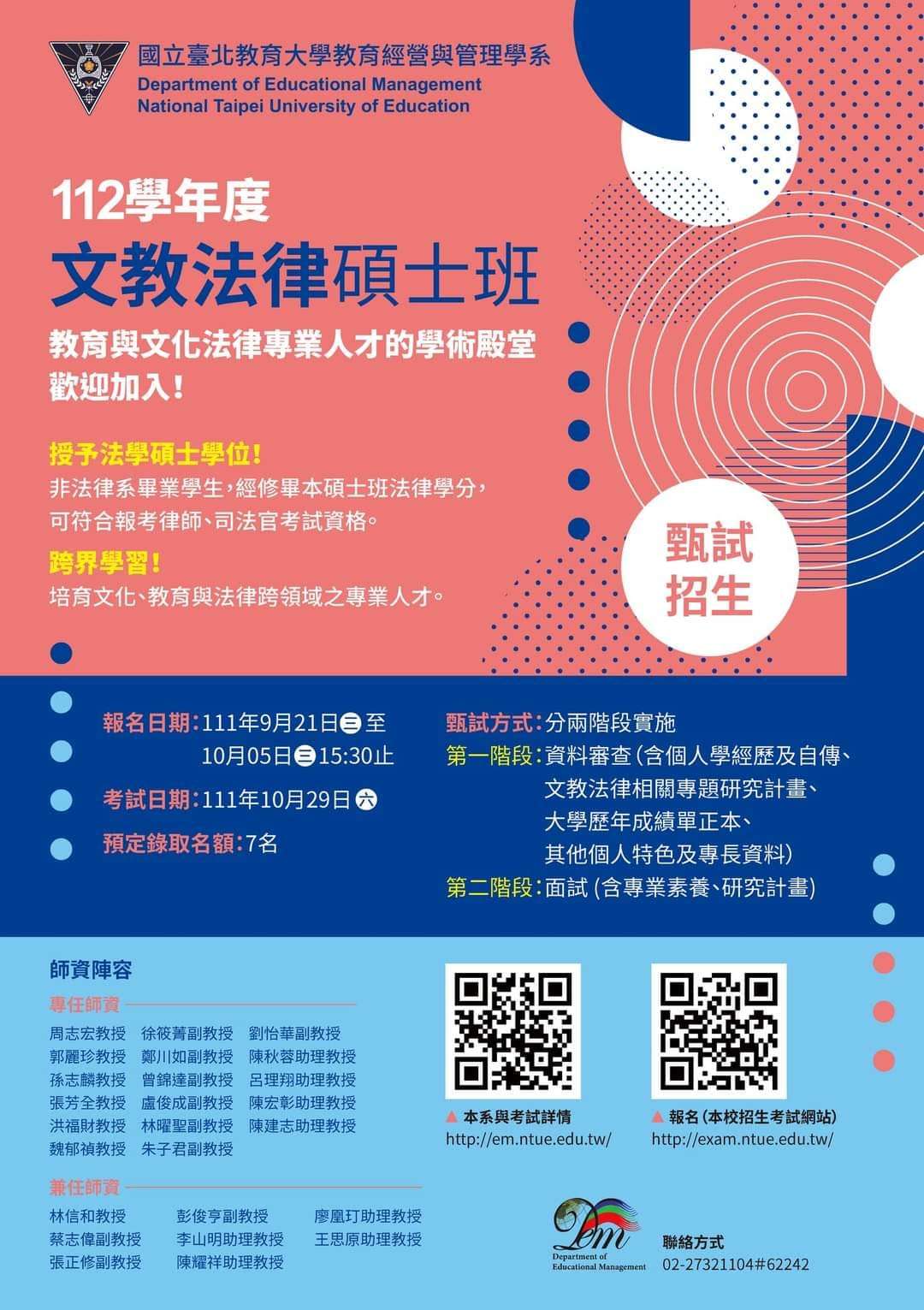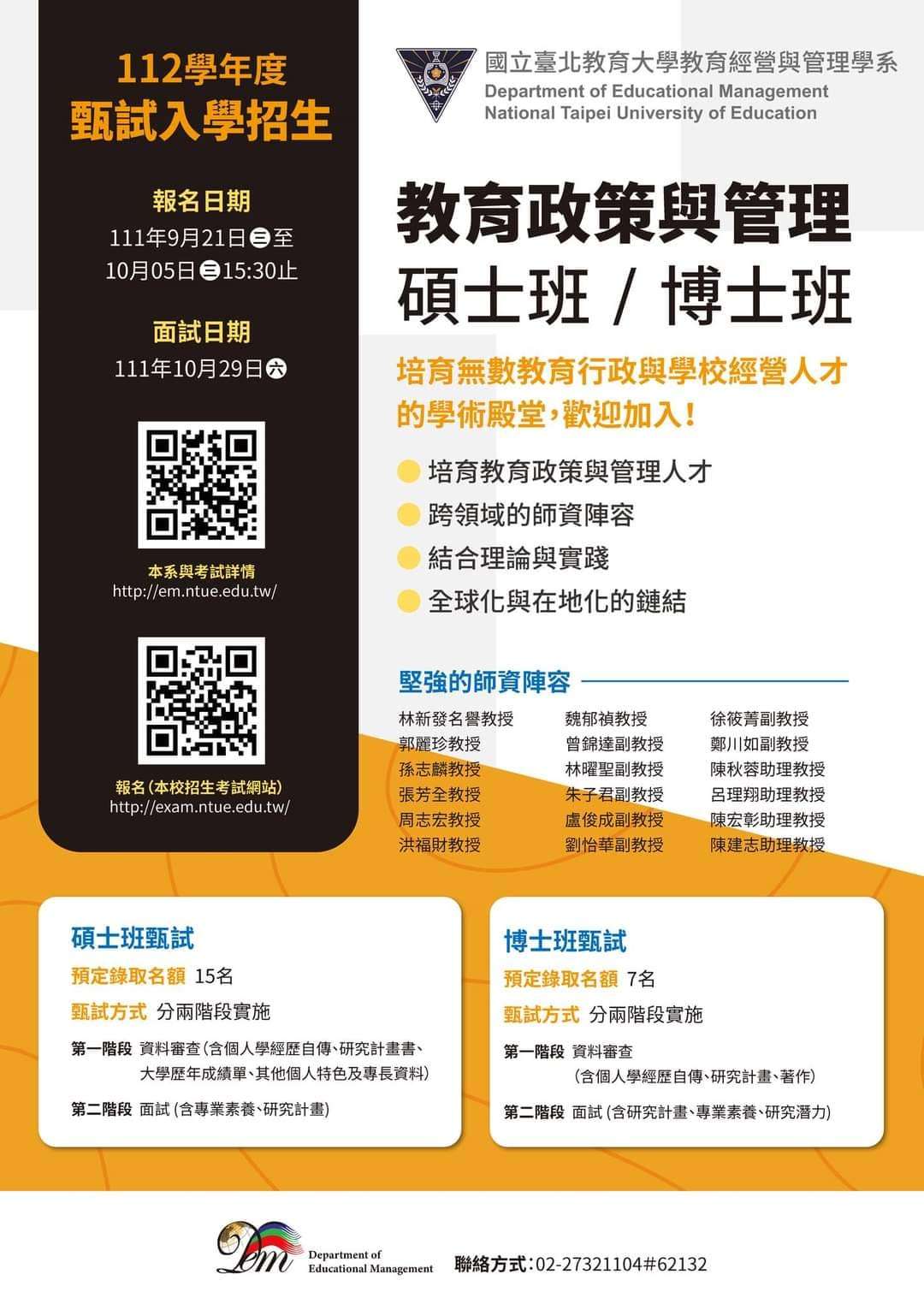 一、本校112學年度教育經營與管理學系碩博士班甄試(包括教 育政策與管理碩士班、博士班、文教法律碩士班)之招生名 額、報考資格、甄試時間、項目及備審資料等規定如附 件。