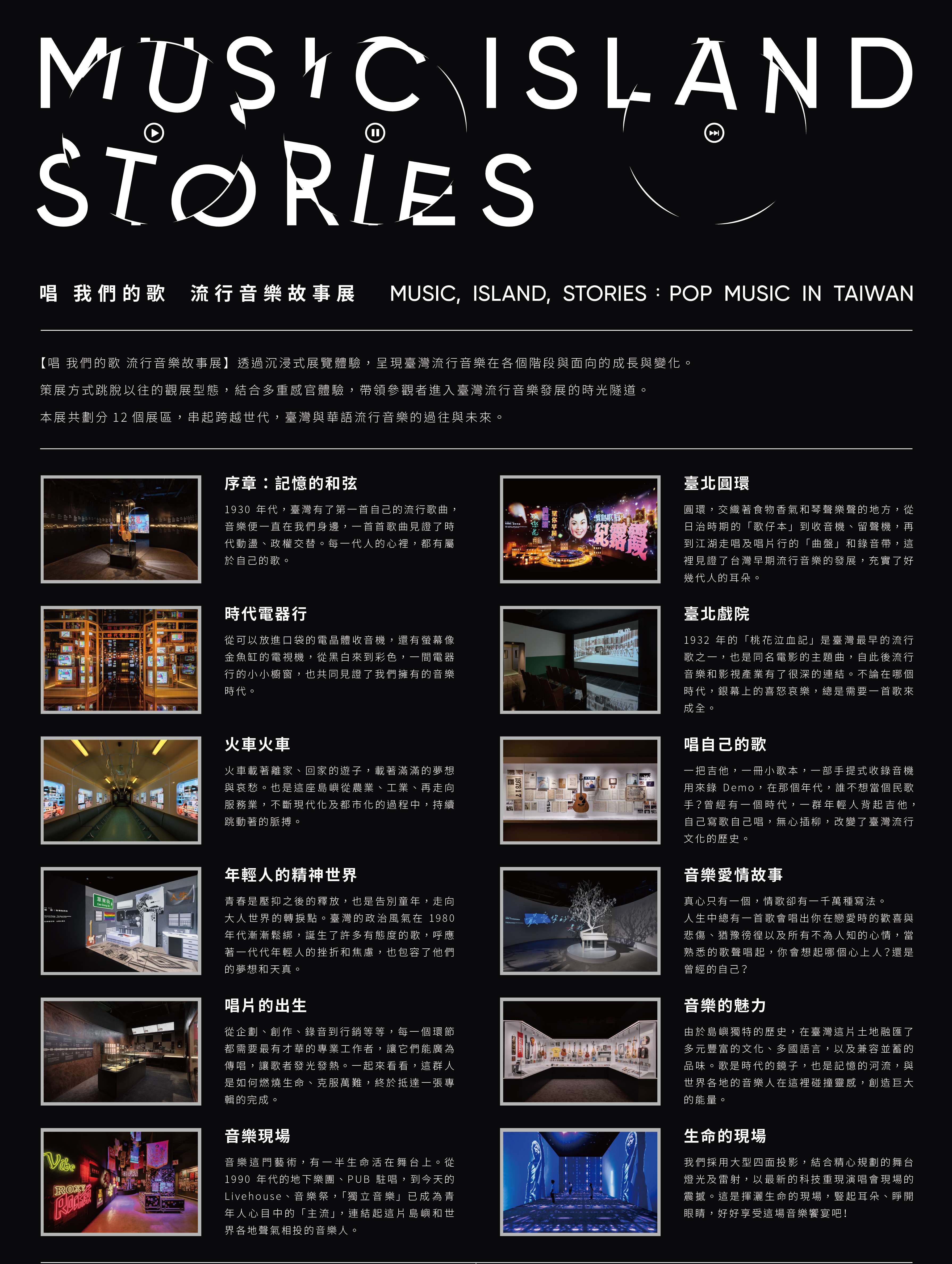二、本館策劃【唱我們的歌-流行音樂故事展】常設展,旨在呈現臺灣流行音樂的演進史,透過沉浸式展覽體驗,呈現臺灣流行音樂在各個階段與面向的成長與變化。策展方式以音樂為主體出發,跳脫以往的觀展型態,結合多重感官 體驗,帶領參觀者進入臺灣流行音樂發展的時光隧道。