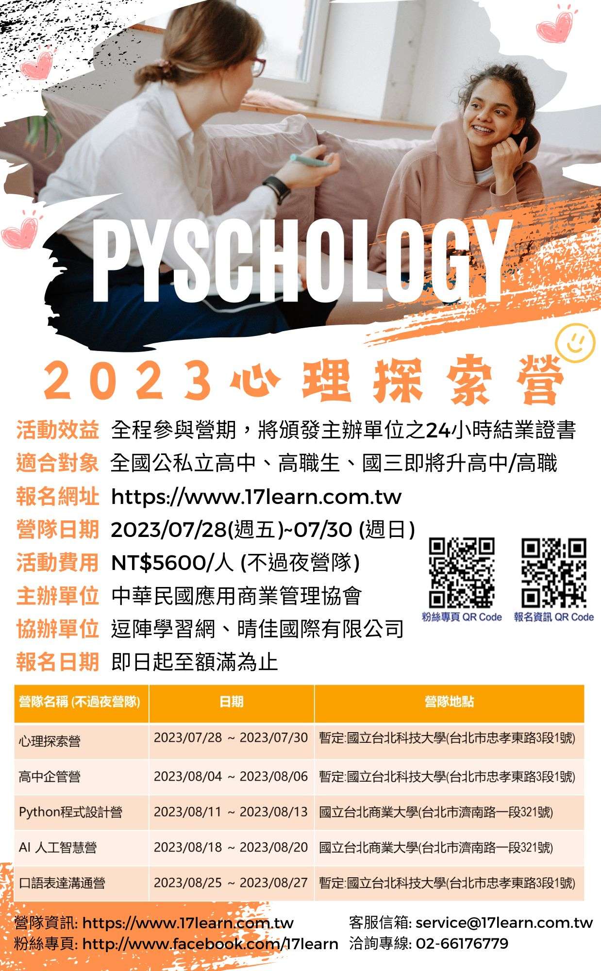 十、詳細營隊訊息及報名網址: http://www.17learn.com.tw 十一、客服專線:service@17learn.com.tw;或洽詢:02-6617- 6779 (上班時間:週一至週五09:30-12:30, 13:30-17: 30)