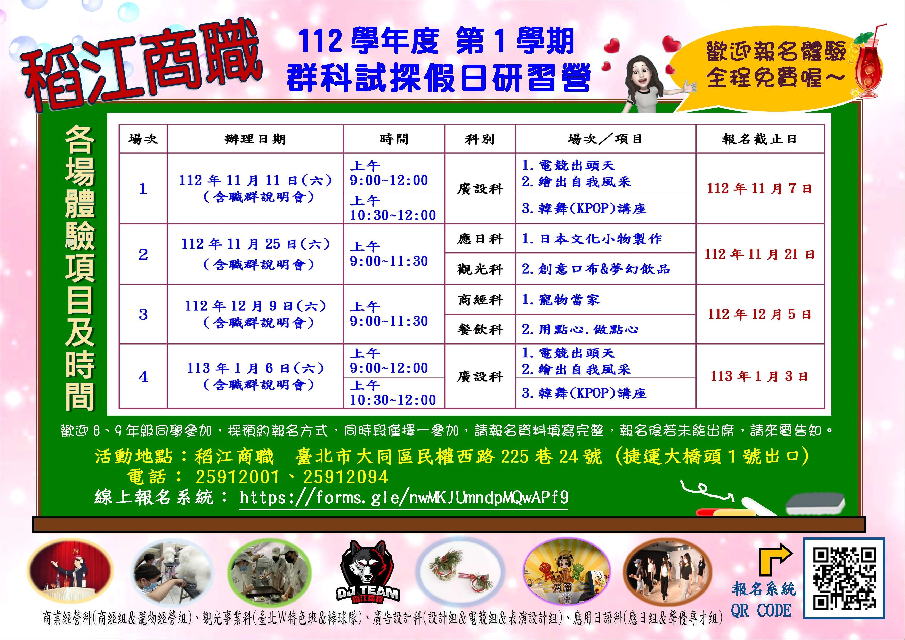 為了讓國中學生能對技職學校各群科多元探索,本學期本校辦理4場假日體驗活動及海報,如附件1、2,敬請協助予 以公告,歡迎國中生踴躍至本校線上報名https://forms. gle/nwMKJUmndpMQwAPf9,參加體驗,活動全程免費。