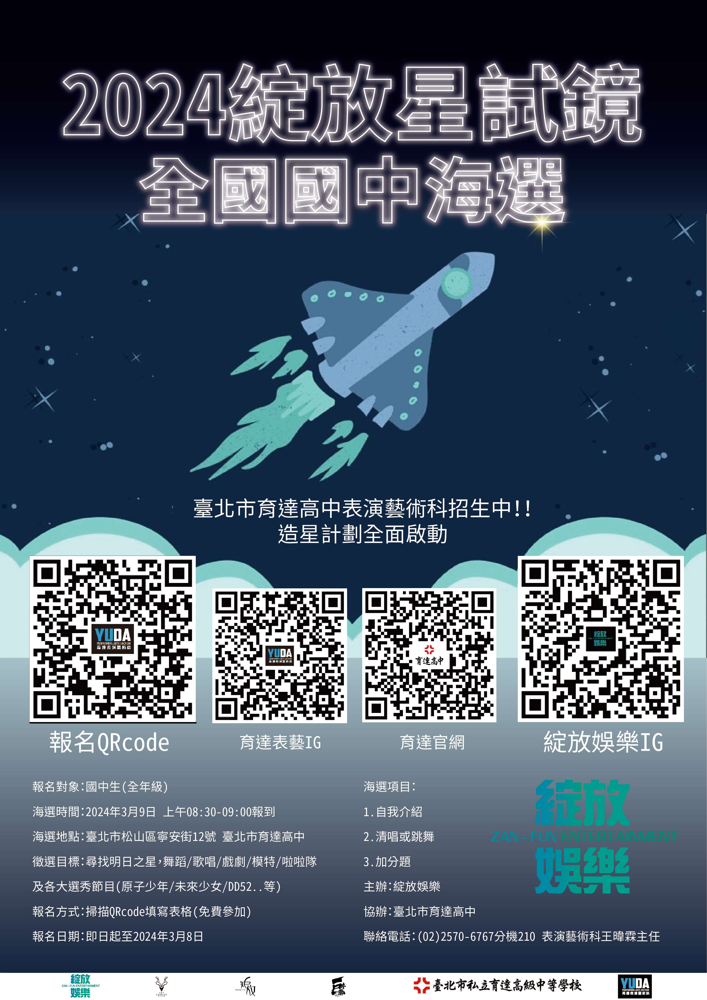 一、綻放娛樂舉辦「2024 綻放星試鏡 - 全國國中海選」,定於2024年3月9日 星期六。