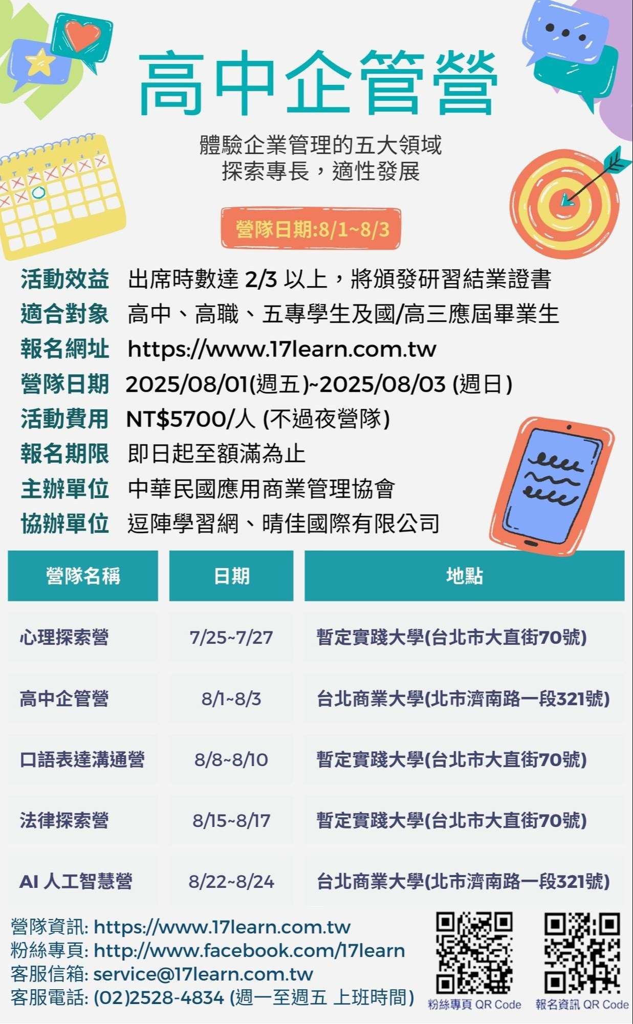 十、另有【心理探索營】、【AI人工智慧營】、【口語表達溝通營】、【法律探索營】等營隊,歡迎報名參加。