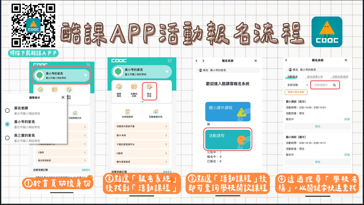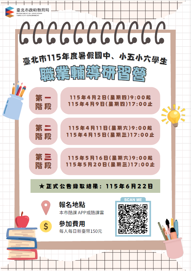 相關報名事宜如下(詳如附件): (一)報名資格:本市公私立國民中學7至9年級學生及國民小 學5、6年級學生。 (二)報名方式: 1、本營隊活動一律採本市「酷課 APP」或「酷課雲」 (網址:https://cooc.tp.edu.tw/)報名,公立學校營隊可以透過「酷課 APP」繳費(繳費方式限用信用 卡、ATM 及線上支付方式);私立學校營隊繳納活動 費請參考各校營隊實施計畫暨研習須知。 2、活動可家長代報或學生自行報名(家長代報須完成親 子綁定,才可幫綁定之子女進 行報名),請預先備妥 「單一身分驗證服務」(網址:https://ldap.tp. edu.tw)帳號以 利報名;倘欲查詢「單一身分驗證」 帳號,請洽原各校資訊組長。 3、114學年度就讀本市之國中小學生。每人可報名之營隊 數量原則上無限制,但若所 選營隊之報名人數大於錄 取人數需抽籤時,至多始能參加2場需抽籤之營隊;毋 需抽籤之營隊則不在此限。 (三)報名日期及錄取公告日期: 1、第1次線上報名:115年4月2日(星期四)起至115年4 月9日(星期四)止,115年4月10日(星期五)由系統 推播發送個人錄取情形。 2、第2次線上報名:115年4月11日(星期六)起至115年4 月15日(星期三)止,115年4月20日(星期一)由系 統推播發送個人錄取情形。 3、第3次線上報名:115年5月16日(星期六)起至115年5 月20日(星期三)止,115年5月21日(星期四)由系 統推播發送個人錄取情形。 (四)報名費用:每人每日新臺幣150元,於校務行政系統依 證明由校方註記為「低收入戶」、「中低收入戶」、 「突遭變故」者得免繳納,研習期間供應午餐,報名經錄取後不論參加與否,不得以任何事由要求退還活動費 用。