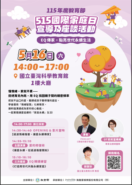 一、依教育部115年4月22日臺教社(二)字第1152401143A號函 辦理。 二、為響應聯合國每年5月15日「國際家庭日」之倡議,教育部 透過舉辦國際家庭日系列活動,旨在以貼近大眾、引發共 鳴的方式進行宣導,讓民眾對家庭教育產生興趣,促進家 庭內各世代間良性互動與理解,共同營造一個能擁抱多 元、支持世代共融的現代家庭環境。 三、旨揭活動訂於115年5月16日(星期六)下午2時至5時,假 國立臺灣科學教育館(臺北市士林區士商路189號)1樓大 廳辦理,此次主題為「EQ傳家,點亮世代永續生活」,將 以邀請學術代表、親職專家與親子教育專家進行三方座談 會為主軸,配合闖關活動、表演節目等方式,宣導「情緒 溝通」及「親子互動」之內涵。 四、活動詳細內容請逕洽本活動承辦廠商-無敵家娛樂股份有限公司,聯絡人:楊雅涵小姐,kerse.ya19980916@gmaicom 及羅琳小姐,lunainsea0716@gmail.com;連絡電話:02- 2557-5258分機12。