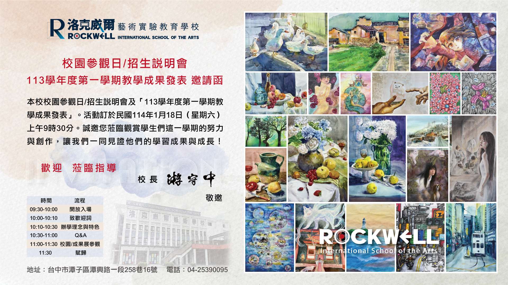 該校為「學校型態」實驗高中,秉持席勒審美教育哲學, 透過個別學習計畫及藝術設計導向實驗教育模式,營造雙 語的住宿學習環境,勾勒出美力、品格力及國際移動力的 學生圖像。 三、校園參觀日詳細訊息如下: (一)時間:114年1月18日(星期六)上午10:00-12:00 (二)參加對象:認同本校教育理念之國中學生與家長 四、學校地址:臺中市潭子區潭興路一段258巷16號 五、歡迎家長與同學參加114年1月18日的校園參觀日 (OpenHouse Day),報名連結:https://forms.gle/hChVR3PADgT9b2FR8